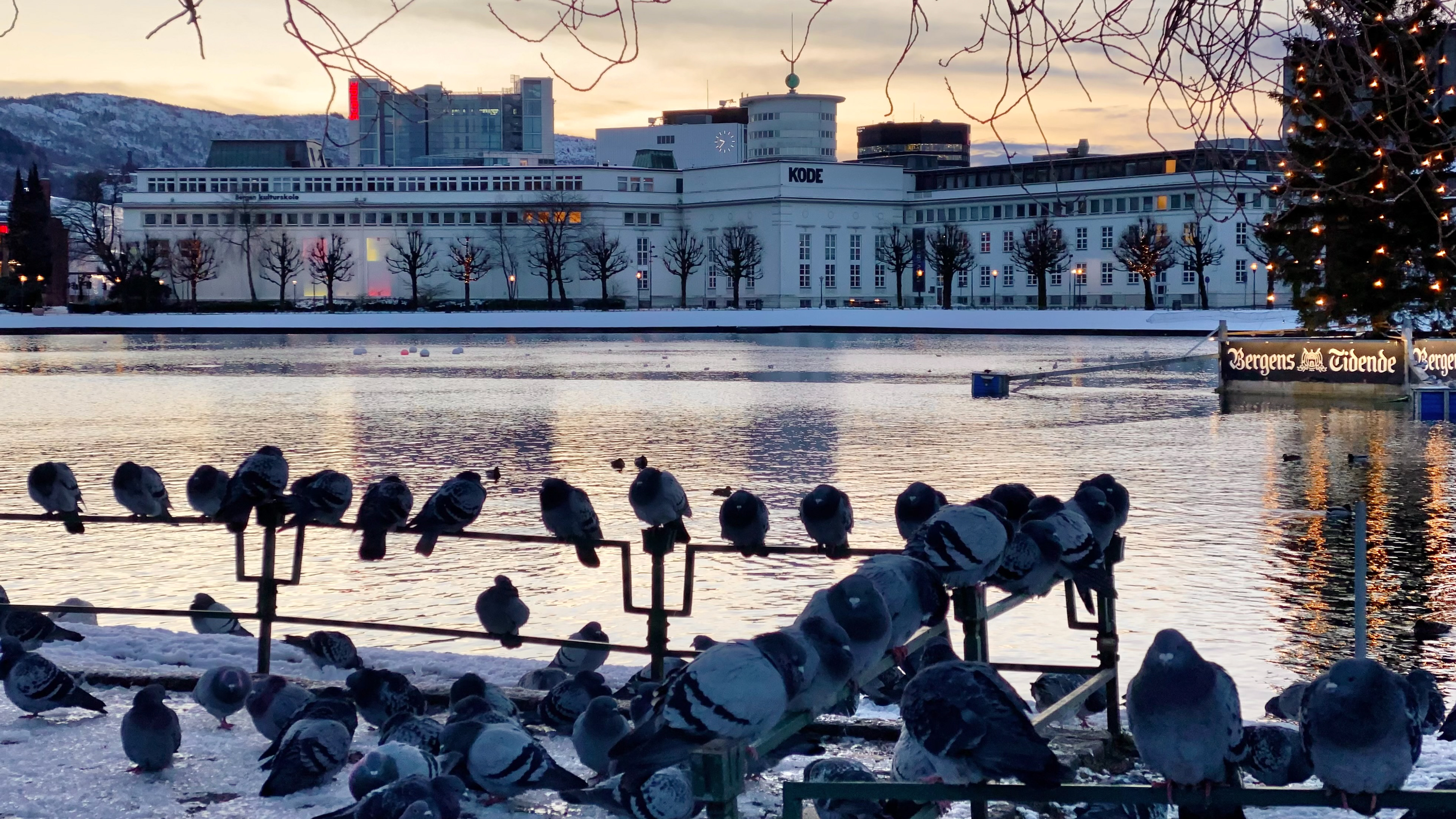 I forgrunnen sitter duer tett i tett på metallrekkverkene langs vannkanten, kroppene rundet mot kulden, hodene trukket ned i fjærdrakten. De danner et rytmisk mønster, som noter på et noteark, mens noen få beveger seg forsiktig på isen og snøkanten nedenfor. Det er en følelse av fellesskap og tålmodighet – et kollektivt pusterom i vinterkulden.