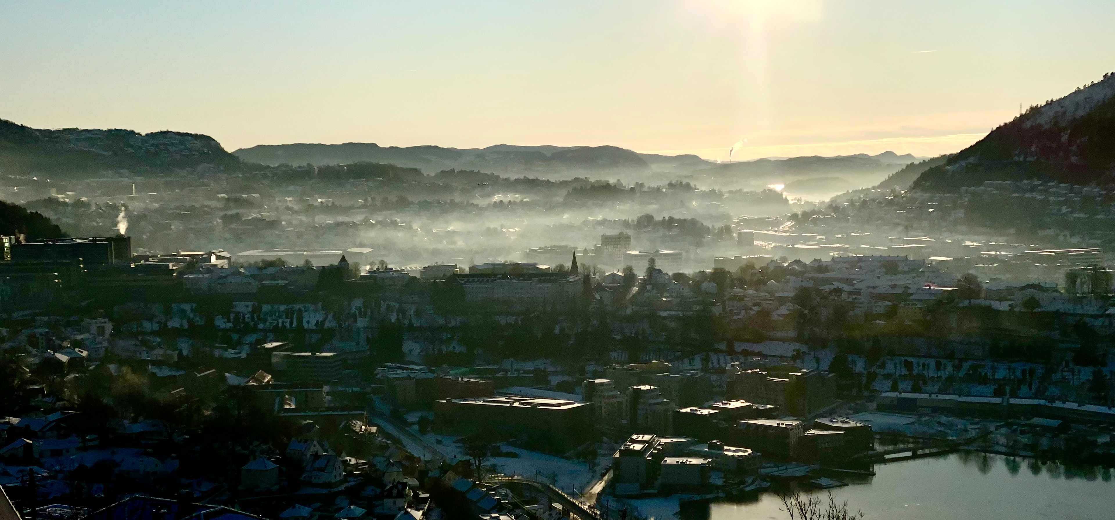 Dette bildet viser et vidstrakt bylandskap badet i lav vintersol. En lett dis svever over hustakene og legger et mykt slør over Bergen, mens åsene og fjellene i bakgrunnen danner rolige, mørke silhuetter. Lyset er gyllent og lavt, som sen ettermiddag, og gir scenen en stille, nesten ettertenksom stemning. Det er kontrasten mellom kulden i bakken og varmen i lyset som gjør bildet særlig stemningsfullt, som om byen akkurat er i ferd med å våkne, eller trekke pusten før dagen går videre.